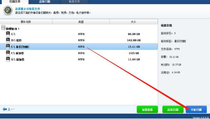 2.进入到恢复删除文件的功能界面之后,我们在其中选中想要扫描恢复文件的磁盘,选中之后点击界面右下角的开始扫描按钮。