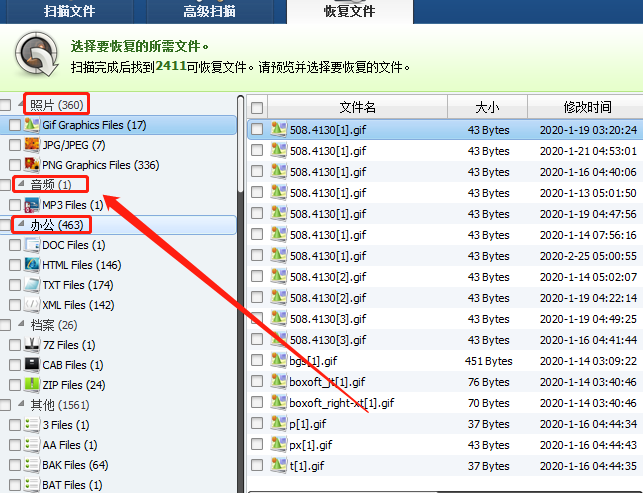 4.等到软件扫描完成之后,在界面中可以看到扫描出来的文件结果,并且被分类显示了,用户可以在其中找到自己想要恢复的文件。