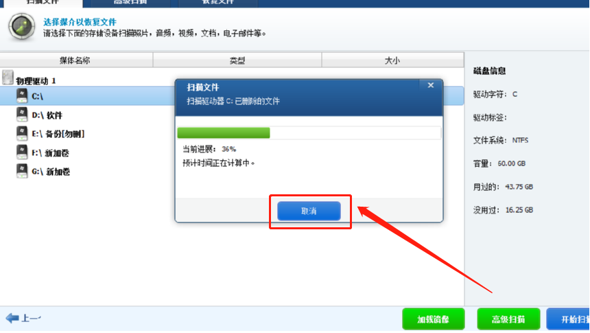 3.点击这个开始扫描按钮之后软件就会开始扫描所选磁盘中的删除文件了,并且在界面中间会显示一个扫描进度,需要中止扫描的用户可以点击取消按钮。