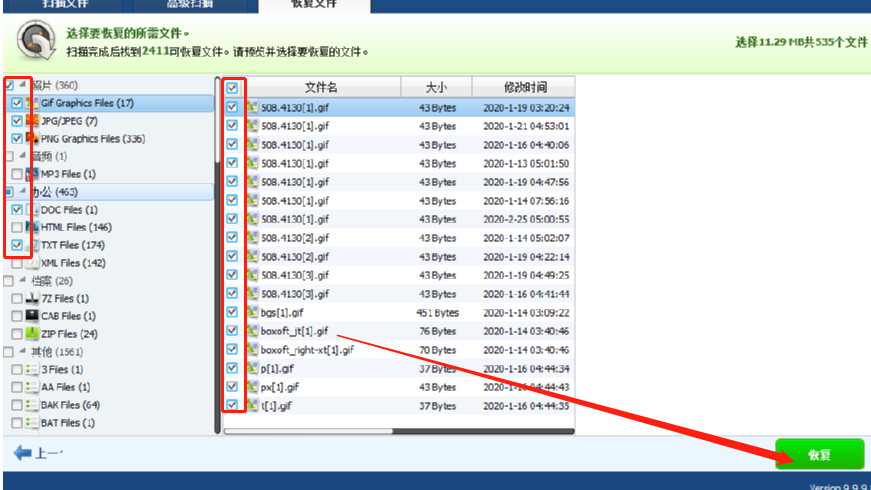 5.找到想要恢复的文件之后,我们勾选文件前面的小方框,勾选之后点击右下角的恢复按钮即可开始恢复操作。