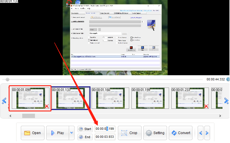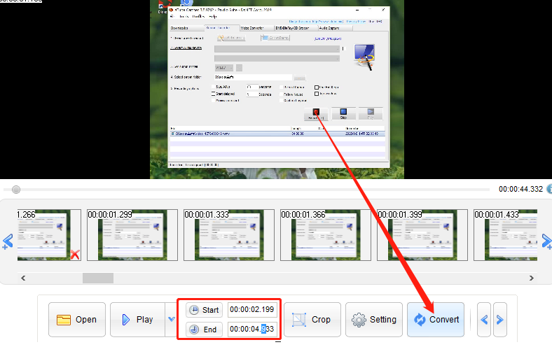 3.视频文件添加到软件之后,我们在界面中可以看到视频的每一帧画面,点击选中之后按下键盘“Delete”键可以将不要的视频片段删除,也可以在下方直接输入转换片段的开始时间和结束时间。