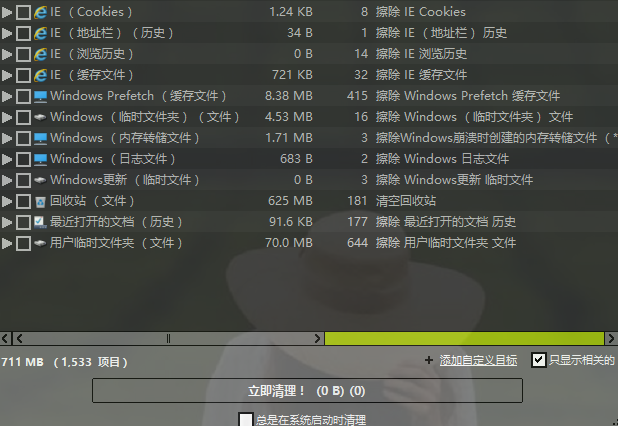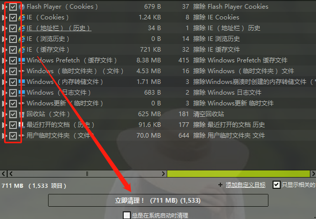 5.下一步回到软件的主界面就可以看到我们添加想要清理的自定义目标了,然后再勾选软件扫描出来的可清理选项之后点击下方的立即清理按钮即可。