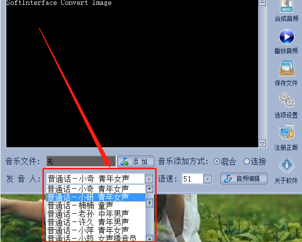 2.要合成的文字输入完成之后在下方发音人这里点击打开下拉列表可以选择要合成音频的发音人,用户可以自行选择。