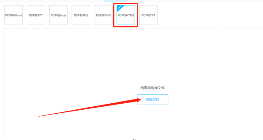 1.首先第一步我们打开软件之后在界面的上方选择PDF转HTML这个功能,然后点击界面中间的选择文件这个功能按钮。