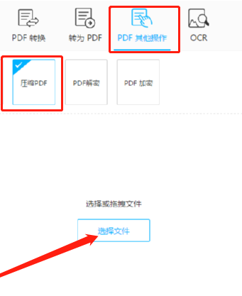 1.首先第一步我们打开软件之后切换到PDF其他操作这个功能界面中,选择PDF压缩功能之后点击界面中的选择文件按钮。