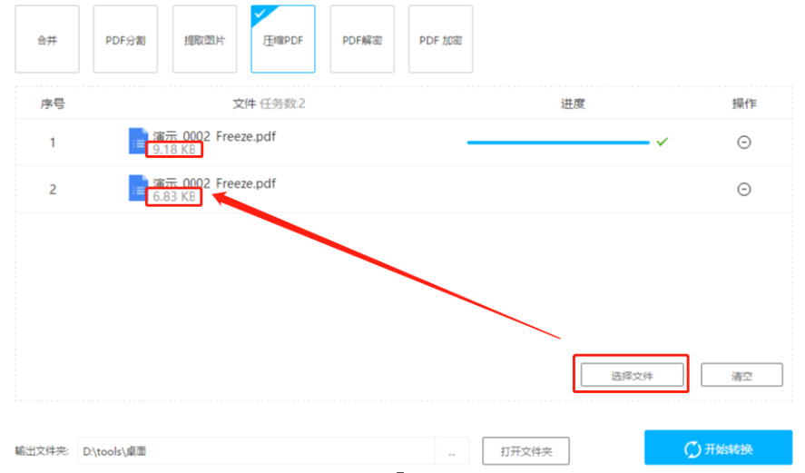6.最后我们可以再次点击选择文件按钮,点击之后将压缩之后的PDF文件添加到界面中,然后就可以看到压缩前和压缩后的文件大小对比了。