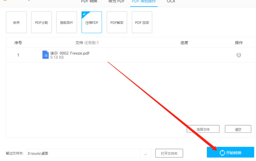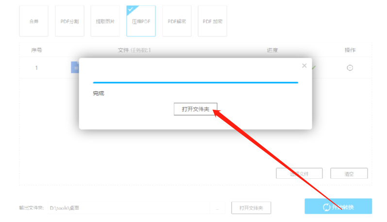 5.点击开始转换之后我们只需要等待转换完成,然后在界面中点击打开文件夹这个功能按钮,点击之后即可查看压缩之后的PDF文件。