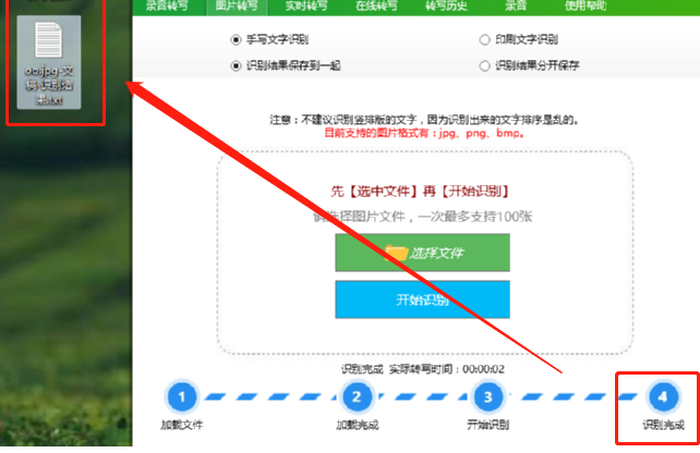 4.点击开始识别按钮之后等待一会在界面下方就可以看到识别完成的提示了,识别之后的结果会保存到电脑桌面上,有Word文TXT文档两个文件。