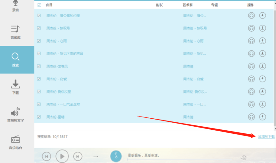 4.另外我们可以点击音乐左边的方框,勾选方框之后即可选中想要下载的音乐,全部选中之后我们点击右下角的添加到下载这个功能按钮即可。