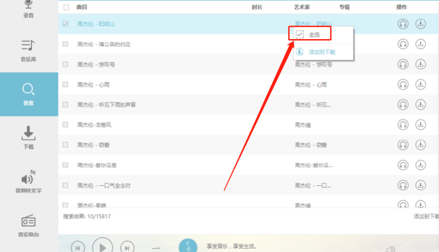 3.等到搜索结果出来之后我们在界面中选中一首音乐,然后用鼠标右键点击它,点击之后就可以点击全选按钮来全部选中这些音乐了。