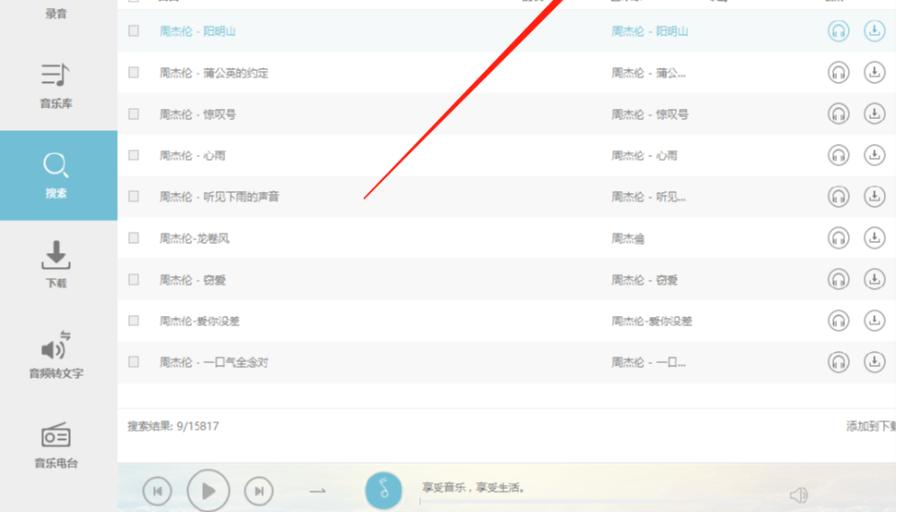 2.切换到搜索界面之后,我们在搜索框中输入想要下载的音乐关键词,输入之后点击右边的搜索图标就可以开始搜索了。