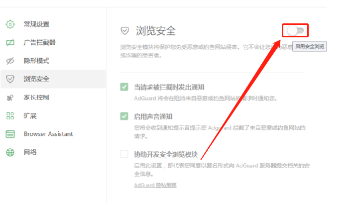 3.进入到浏览安全之后我们可以看到浏览安全的功能是保护用户免受钓鱼网站的侵害,这是一个非常有用的功能,然后我们点击它的功能开关将它开启。