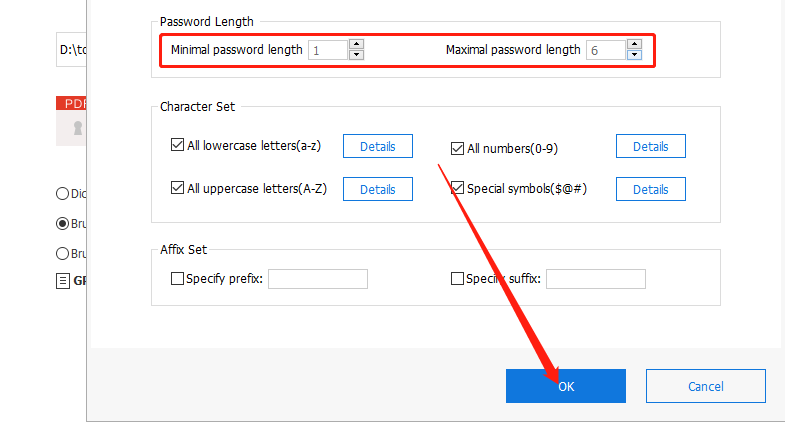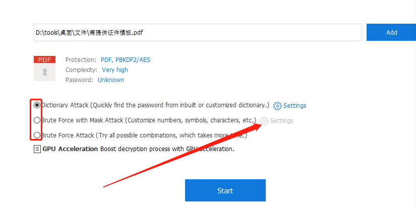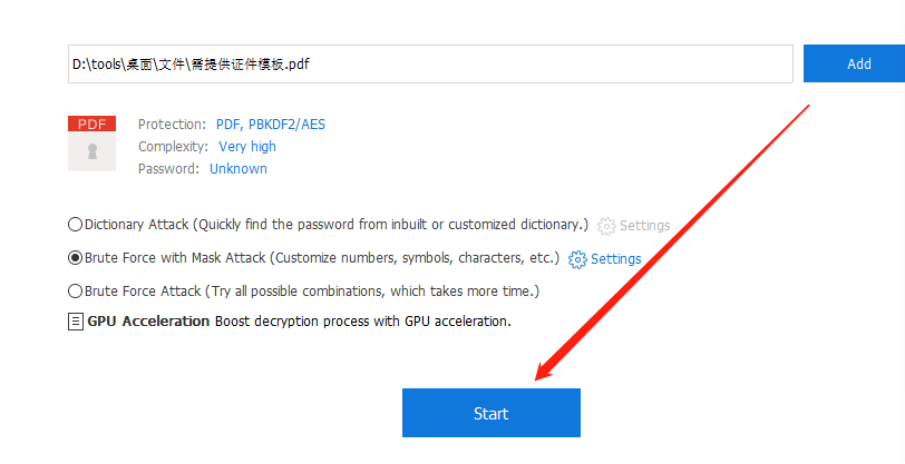 5.选择破解方式并设置好密码参数之后我们就可以回到主界面中点击Start这个开始按钮来开始破解PDF文件密码的操作了。