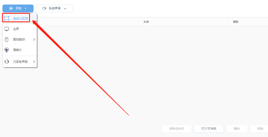1.首先第一步我们打开软件之后点击录屏功能,然后点击界面左上方录制选项,在出现的选项中点击自定义区域。