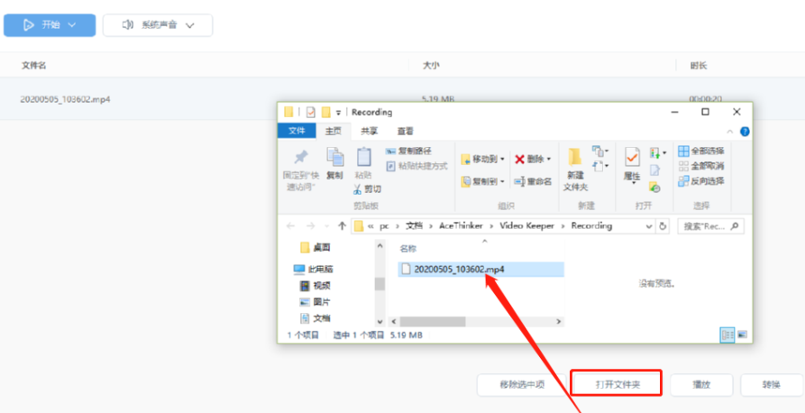 6.点击这个停止按钮之后录制的视频就会自动保存到软件界面,然后我们点击打开文件夹按钮即可打开查看录制之后的视频文件。