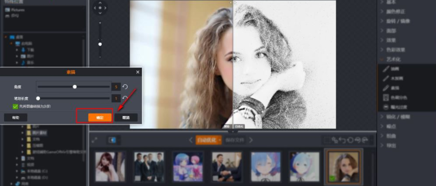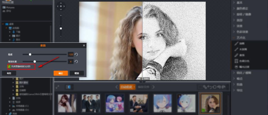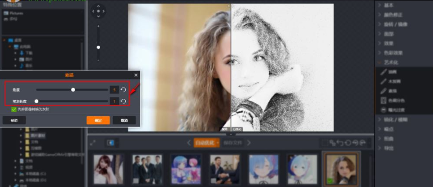 7、用户可以调整角度、笔画长度这两项参数来调整素描效果,并支持用户直接在预览窗口进行预览。