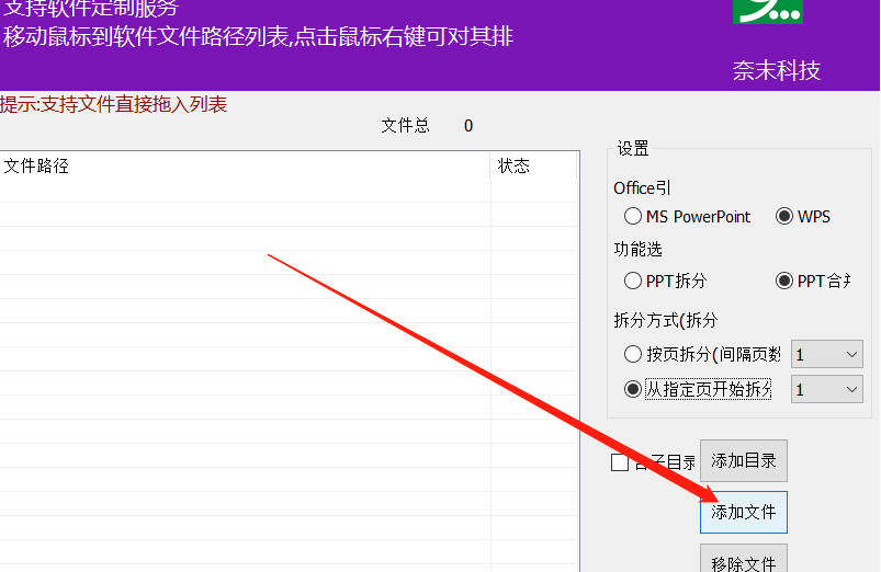 1.首先第一步我们打开软件之后在软件中点击添加文件这个功能按钮,点击这个添加文件的按钮之后可以添加要进行拆分操作的PPT文件。