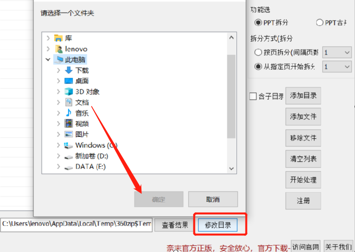 4.选择好拆分方式之后我们点击界面中的修改目录这个功能按钮可以修改文件拆分之后的储存位置,这样方便我们查找。