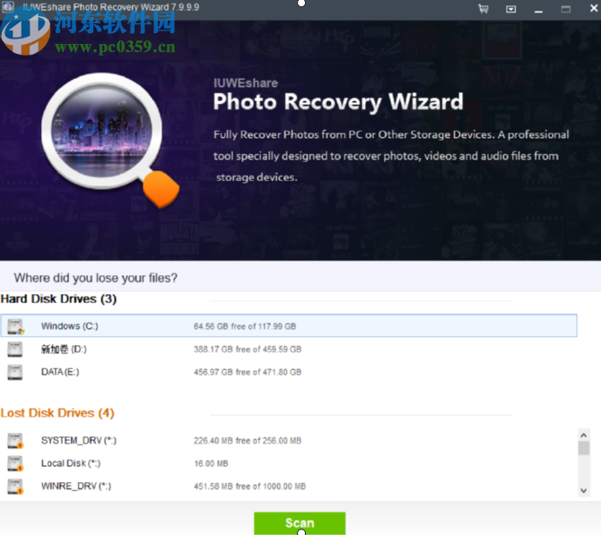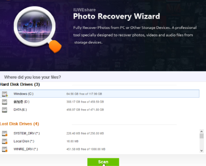 IUWEshare Photo Recovery Wizard是一款能够帮助用户恢复电脑数据的功能软件,这款软件中能够恢复电脑上的一些丢失文件和已经删除掉的文件。如果用户在使用电脑的过程中需要恢复电脑中的删除数据或者丢失数据的话就可以通过这款软件来进行恢复。相信有很多用户都会有这个需求,那么今天小编就来跟大家分享一下使用IUWEshare Photo Recovery Wizard这款软件来恢复电脑文件的操作方法吧,感兴趣的朋友不妨一起来看看这篇方法教程,希望能够帮到大家。