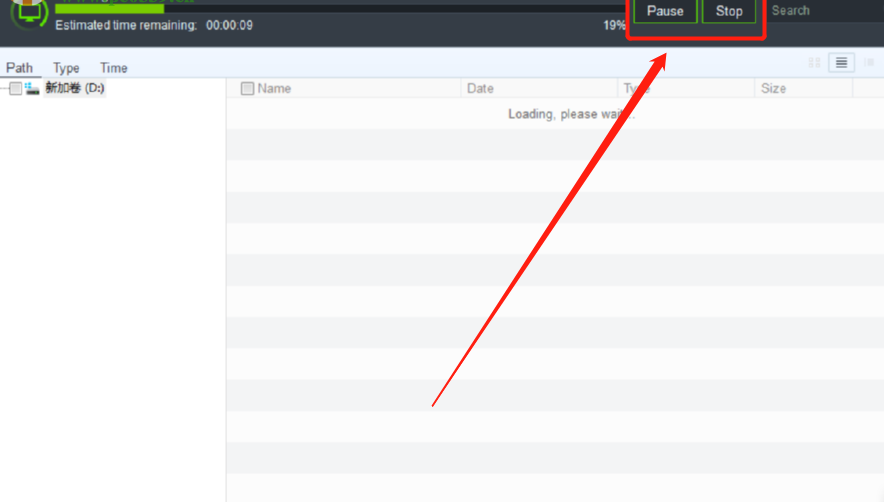 2.开始扫描之后在界面的上方可以看到扫描进度,然后可以点击下图中框出的按钮来暂停扫描和停止扫描。