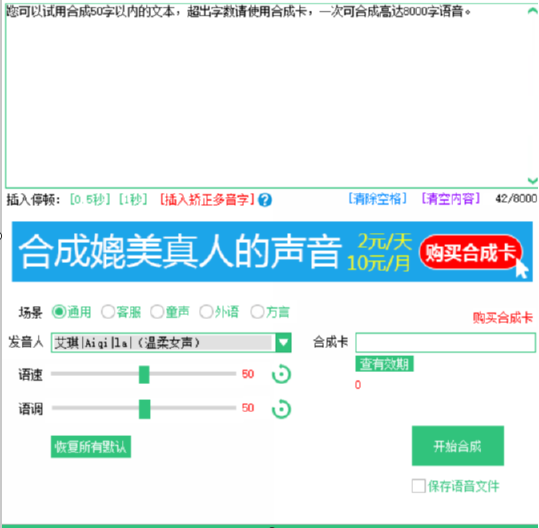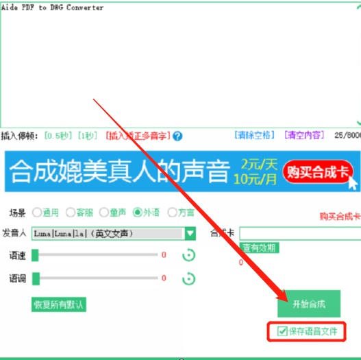 5.最后我们完成以上步骤以后,就可以点击右下角的开始合成按钮来开启合成操作了,并且需要勾选上保存语音文件这个功能选项。