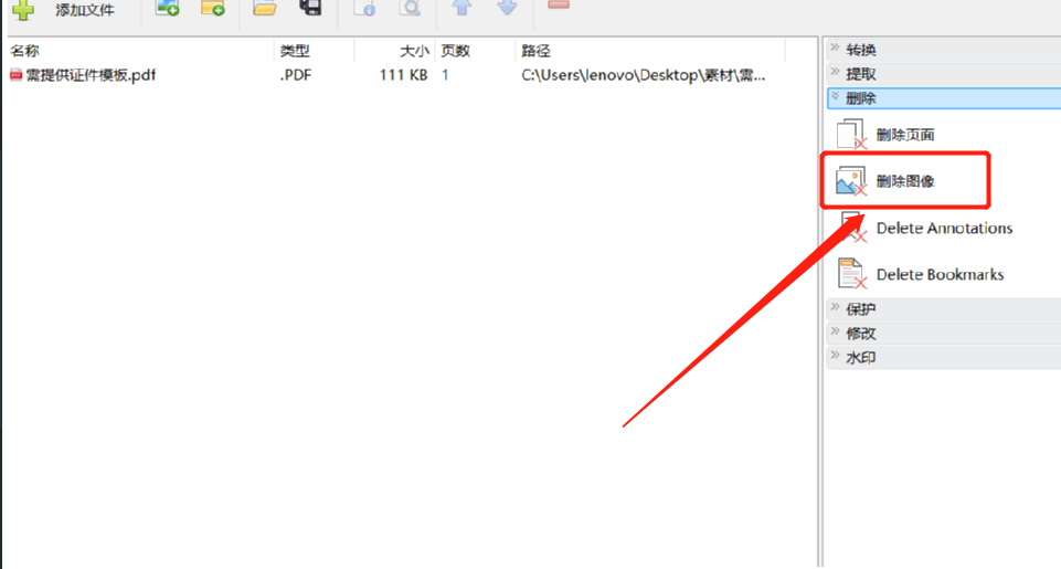 3.点击打开按钮将PDF文件成功添加到软件界面之后,下一步就可以在界面右边打开删除功能模块,然后点击其中的删除图像。
