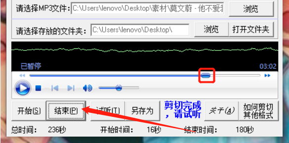 5.使用同样的方法将播放进度条移动到想要剪切的结束时间之后点击下方的结束按钮就可以选取结束的时间了。