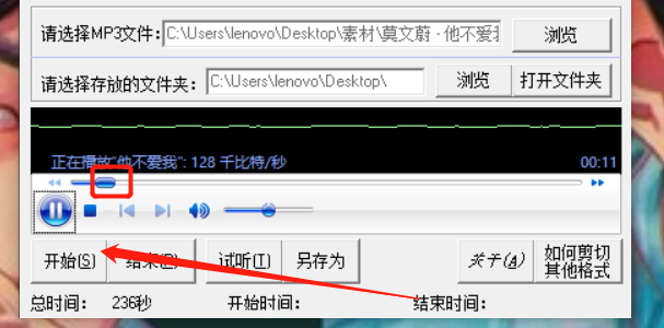 4.然后下一步我们就可以开始设置剪切文件的开始时间和结束时间了,将播放进度条移动到想要剪切的开始时间位置之后点击下方的开始按钮。