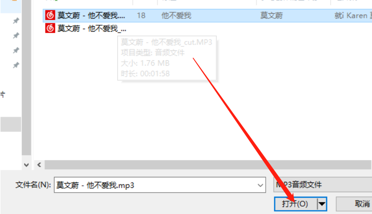2.在打开选择文件的界面之后,在这个界面中我们选中要剪切的音频文件之后点击界面下方的打开按钮。