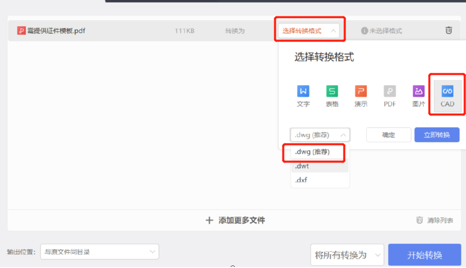 3.点击打开按钮将文件成功添加进来之后,下一步就是在界面中选择要转换的格式,选择CAD文件之后可以选择CAD文件的后缀格式。