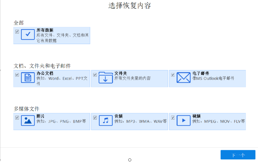 1.首先第一步我们打开软件之后在软件的主界面中需要先选择要扫描恢复的数据类型,选择之后点击右下角的下一个按钮。