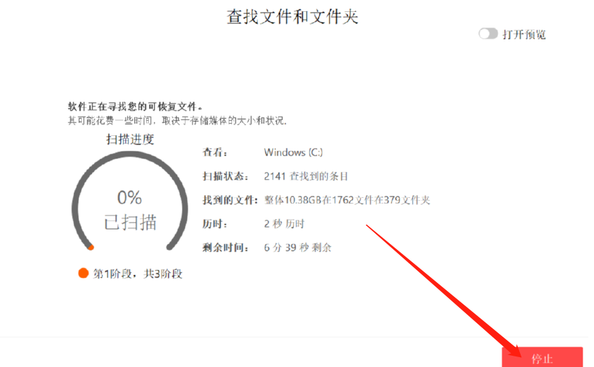 3.点击扫描按钮之后界面就会显示正在扫描了,在扫描的过程中可以点击右下角的停止按钮来停止扫描。