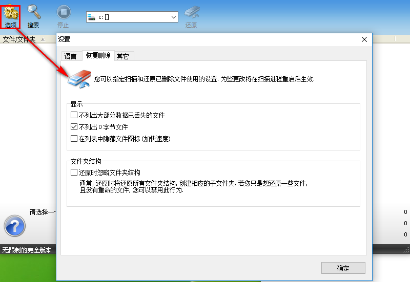 2、我们点击“选项”按钮,进入如下所示的设置界面,用户可以根据自己的需要对语言、恢复删除、其他的选项进行设置。