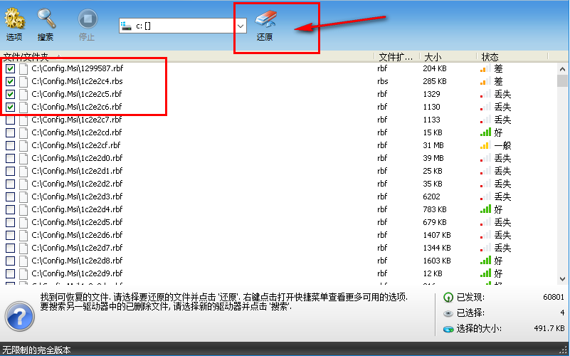 6、搜索完成后,我们勾选要恢复的内容,然后点击“还原”按钮。