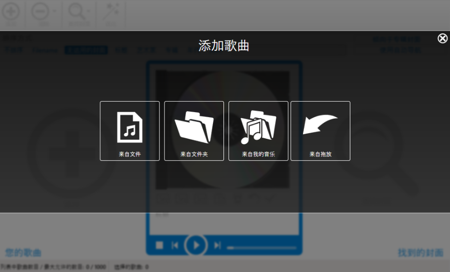 3、随即呼出如下的添加歌曲界面,用户可以选择来自文件、来自文件夹、来自我的音乐等方式进行添加。