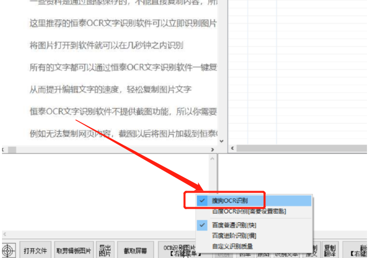 3.点击打开按钮之后图片就被成功加载到软件中来了,然后我们点击这个界面中的OCR图片识别按钮,用鼠标右键点击它,点击之后在出现的选项中点击搜狗OCR识别选项。