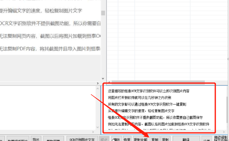 4.完成上一个步骤之后就会开始识别操作了,等到识别完成以后我们在界面的右下方可以看到识别出来的一些文字内容,我们点击复制按钮就可以将它们复制出来使用了。