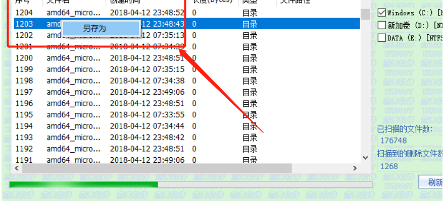 3.等到扫描完成之后我们在主界面中就会看到扫描得到的一些文件列表了,我们在其中找到想要恢复的那一个文件,然后用鼠标右键点击它,选择另存为。