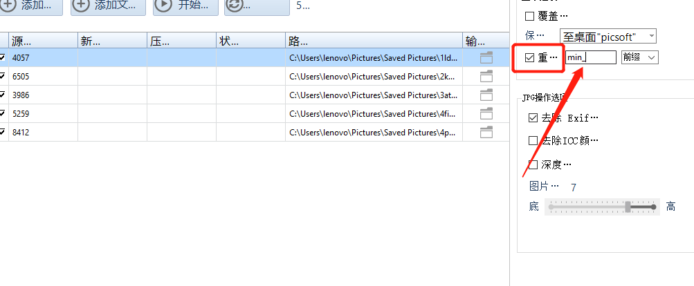 3.将要压缩的JPG图片全部添加到软件界面之后,我们在界面的左边基本选项中选择设置压缩之后的文件名称,是重命名还是覆盖原文件。