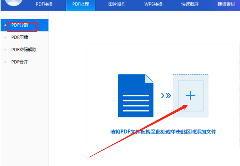 2.切换到PDF处理功能之后,在界面左侧点击PDF分割功能,然后点击界面中的加号图标,点击之后可以添加文件。