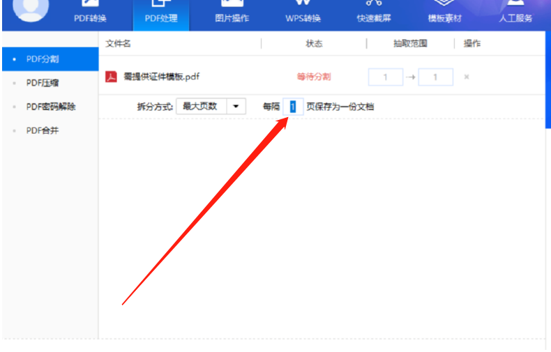 4.点击打开按钮之后文件就成功添加进来了,下一步我们可以设置每几页文档分割为一个PDF文件,都是可以根据个人需求选择设置的。