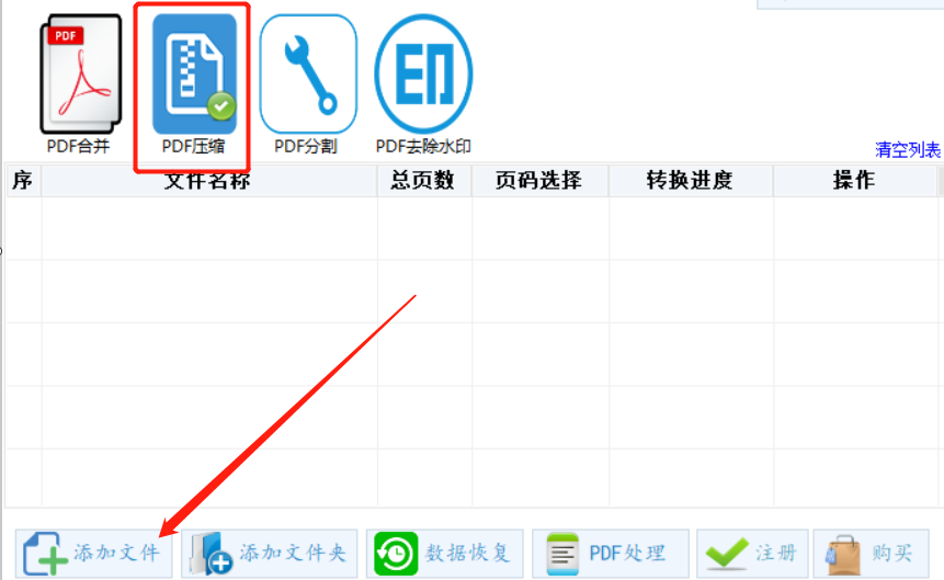 2.打开PDF处理功能模块之后,我们在其中选中PDF压缩这个功能,然后点击左下角的添加文件按钮就可以添加文件了。