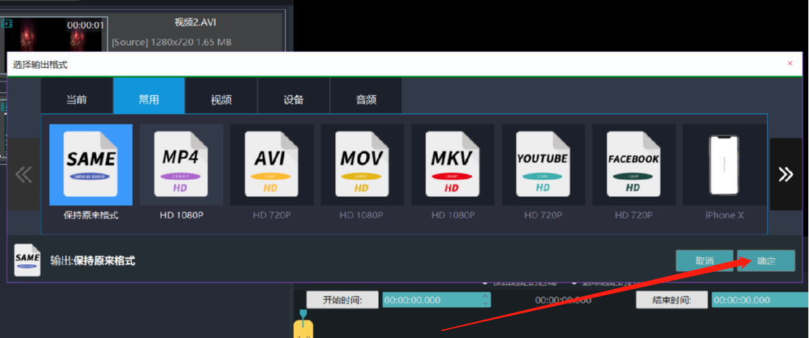 5.点击合并视频之后会出现一个让我们选择合并之后的文件储存视频格式的界面,在其中我们选择合并视频的目标格式之后点击确定按钮即可开始合并。