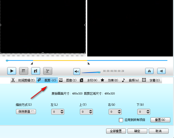 5、也可以对裁剪设置,原始画面尺寸:480x320,裁剪区域尺寸:480x320,自己设置吧