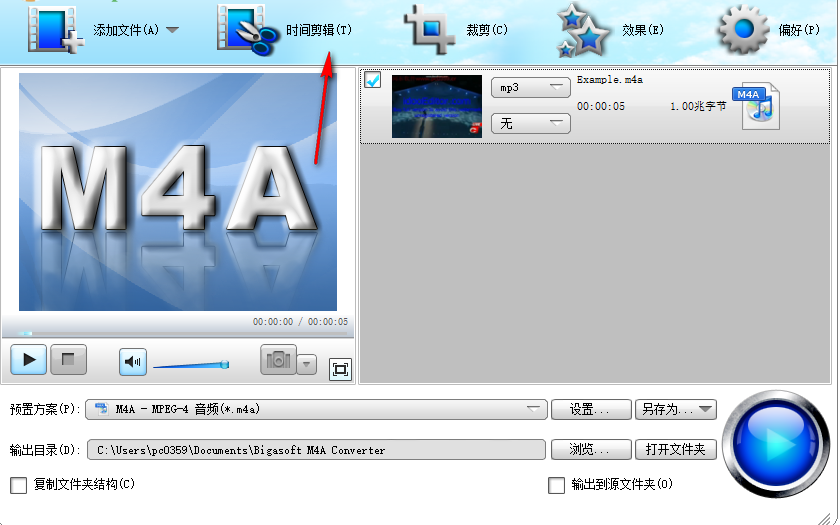 Bigasoft M4A Converter提供的编辑方式还是非常简单的,你可以按照软件的提示在对应的项目编辑内容,提供输入对应的参数就可以执行时间剪辑了,你也可以将音频文件添加到时间剪辑界面。
