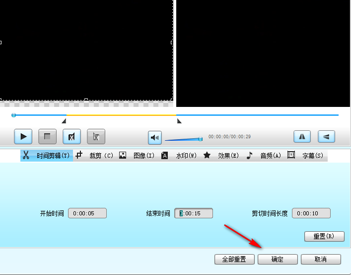 4、这里可以设置开始的时间,可以设置5秒,可以设置结束时间,可以设置第十五秒结束,立即统计本次剪辑的时间为十秒钟