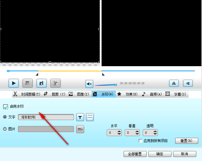 7、如果你需要对图像设置水印,可以在这里编辑文字或者是图像,在播放的时候就显示水印了