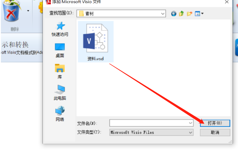 2.点击打开选择文件的界面之后,我们在其中找到要转换的Visio文件,为.vsd后缀,找到选中之后点击打开。