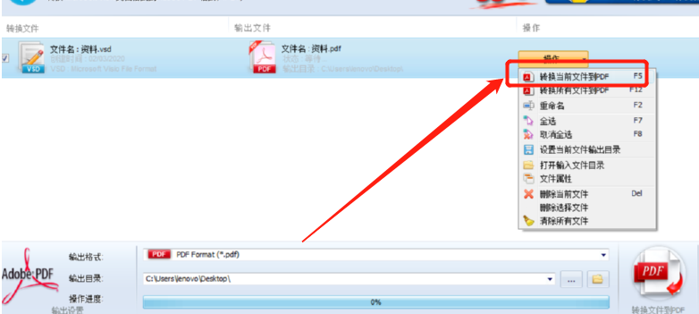 5.最后一步我们可以点击界面右下角的转换文件到PDF这个按钮开始转换操作,也可以点击文件列表后面的转换按钮,在出现的选项中点击转换当前文件到PDF这个功能。