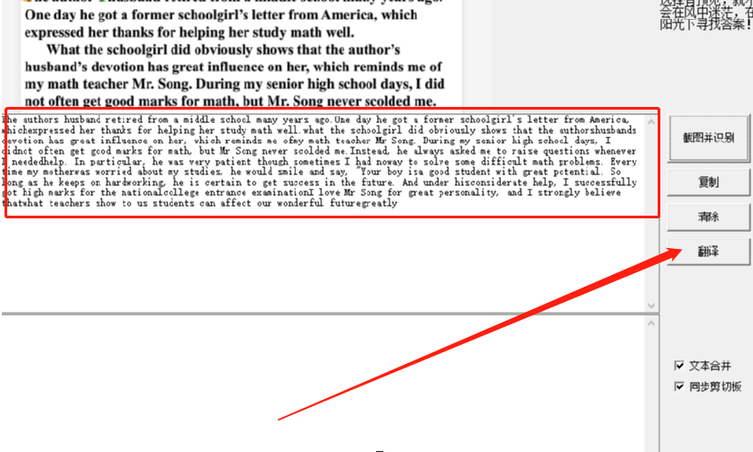 3.要识别的区域截图完成之后,下一步在软件中就会自动进行识别了,等到识别完成之后在中间的区域中会显示识别出来的英文内容,然后我们可以点击翻译这个按钮。